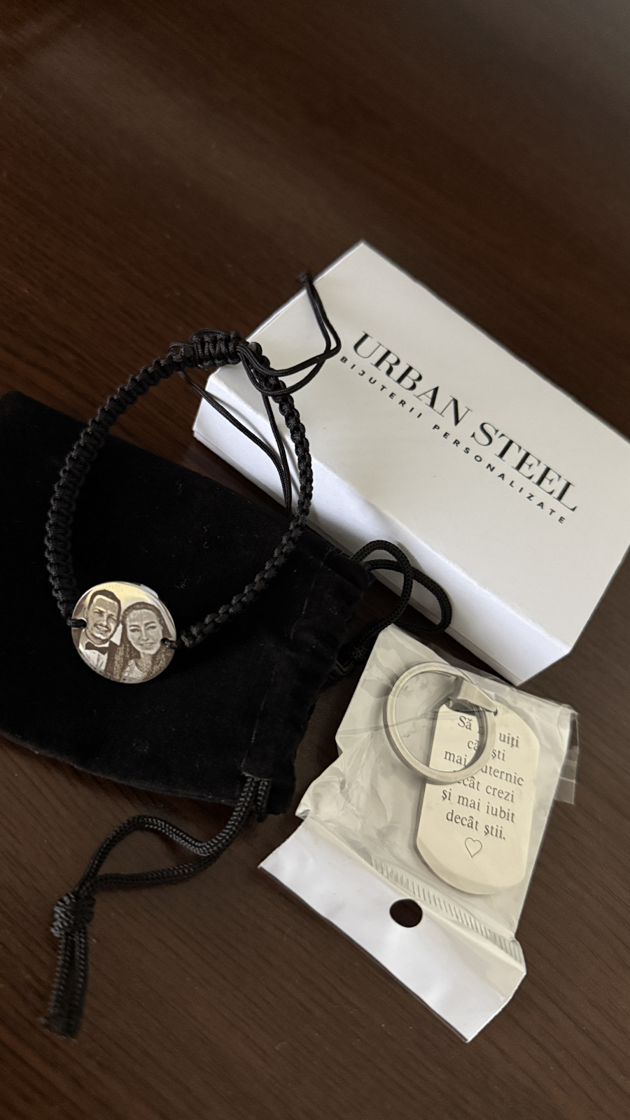 Urban Steel Brățară cu Bănuț Personalizat cu Poză și Text din Oțel Inoxidabil, Șnur Reglabil + CADOU