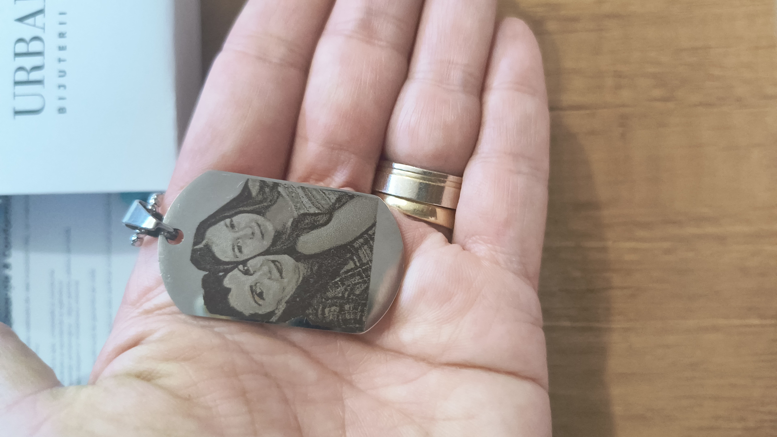 Bijuteria este realizată din oțel inoxidabil de calitate superioară, hipoalergenic și rezistent la uzură. Plăcuța Army poate fi gravată cu o fotografie specială (voi doi, familia, copiii) și un mesaj personal: un jurământ, o dată importantă, o declarație de dragoste sau un text motivațional.