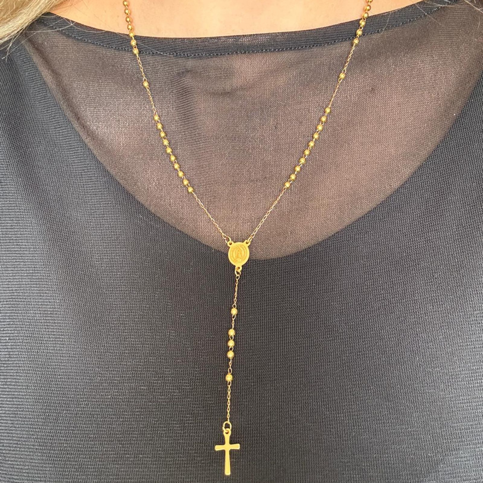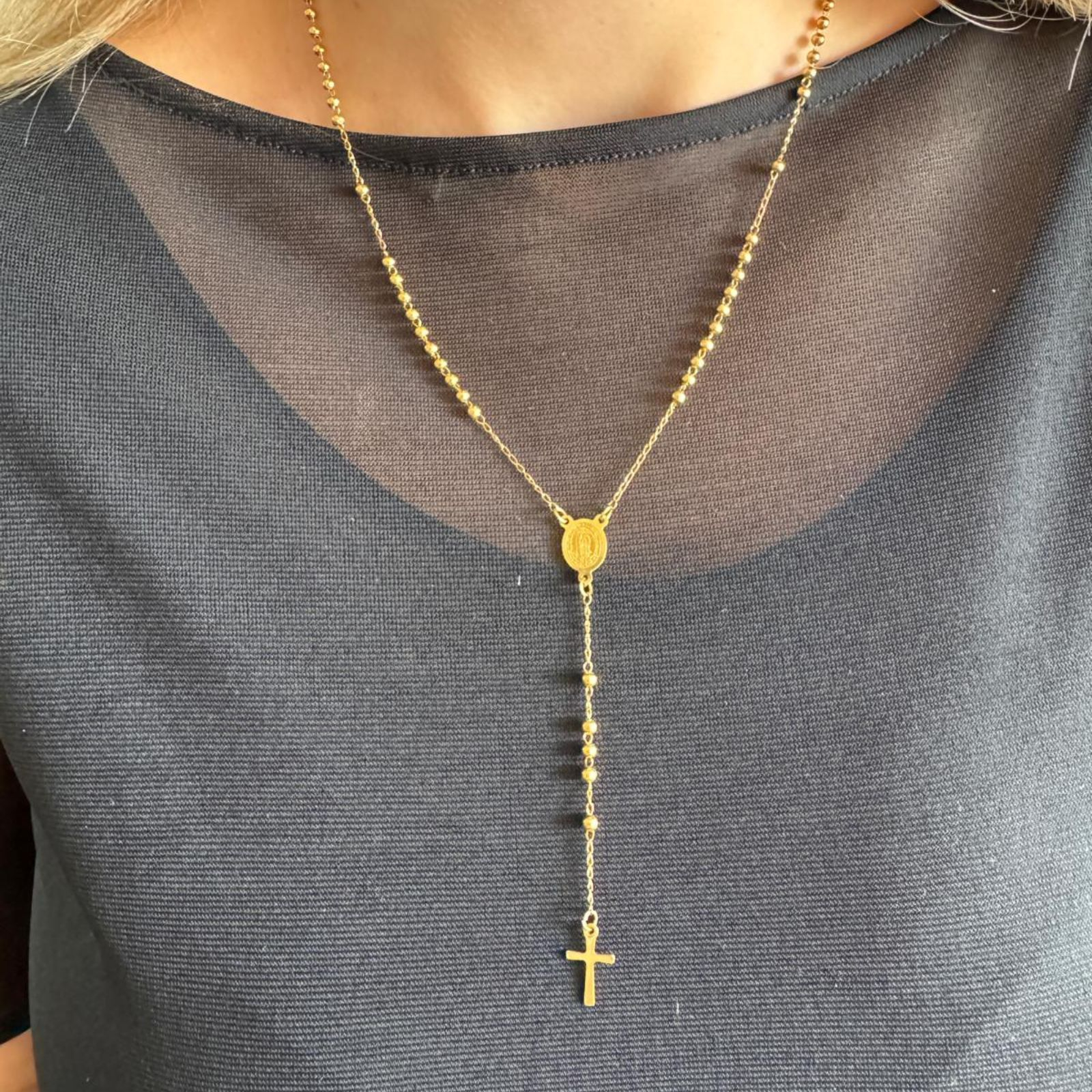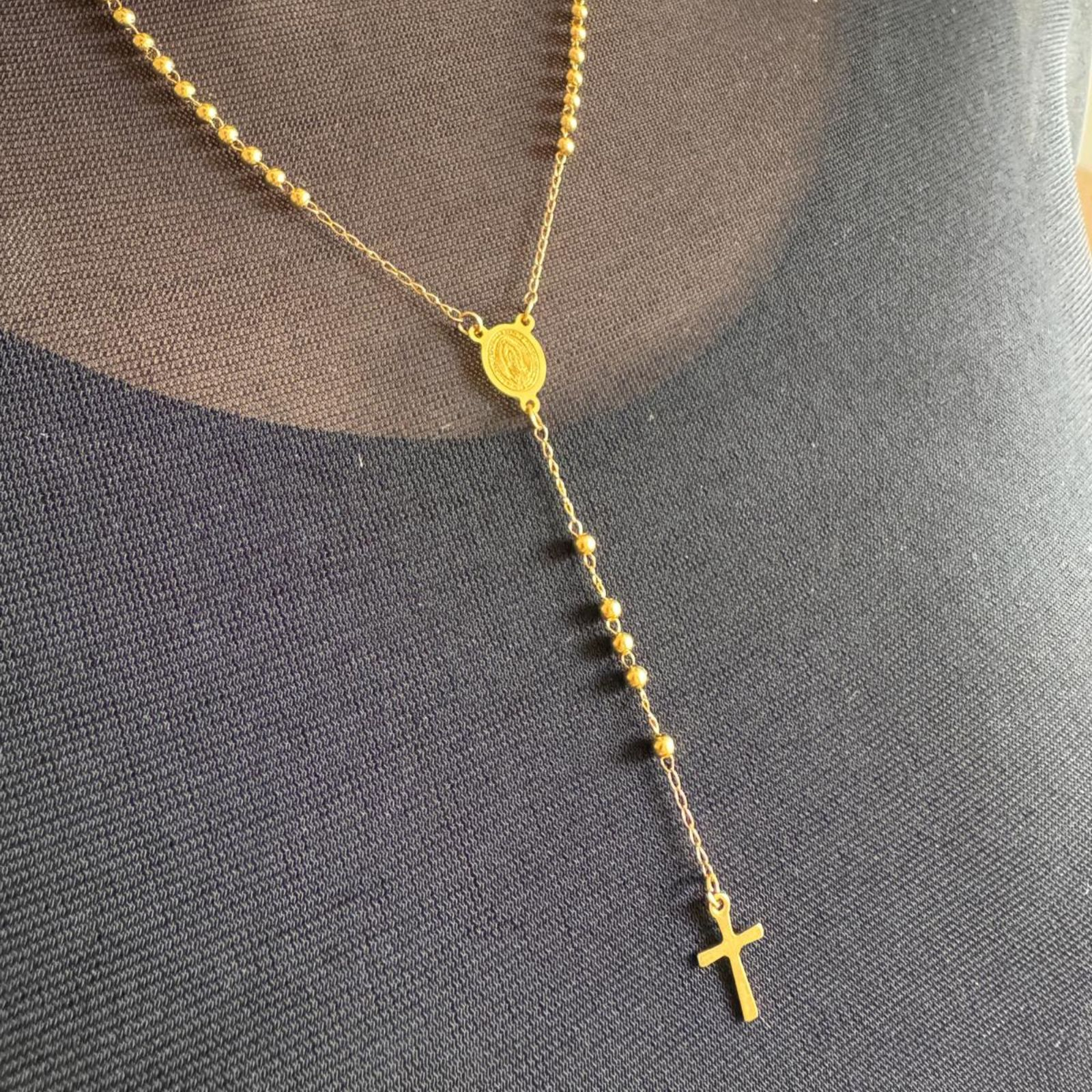 Rozariul are o lungime totală de 53 cm, la care se adaugă segmentul cu cruce de 9 cm, formând o bijuterie echilibrată și plină de simbolism. Este alcătuit din biluțe aurii de 3 mm, un medalion central cu imaginea Fecioarei Maria și o cruce fină, toate din oțel inoxidabil placat auriu.