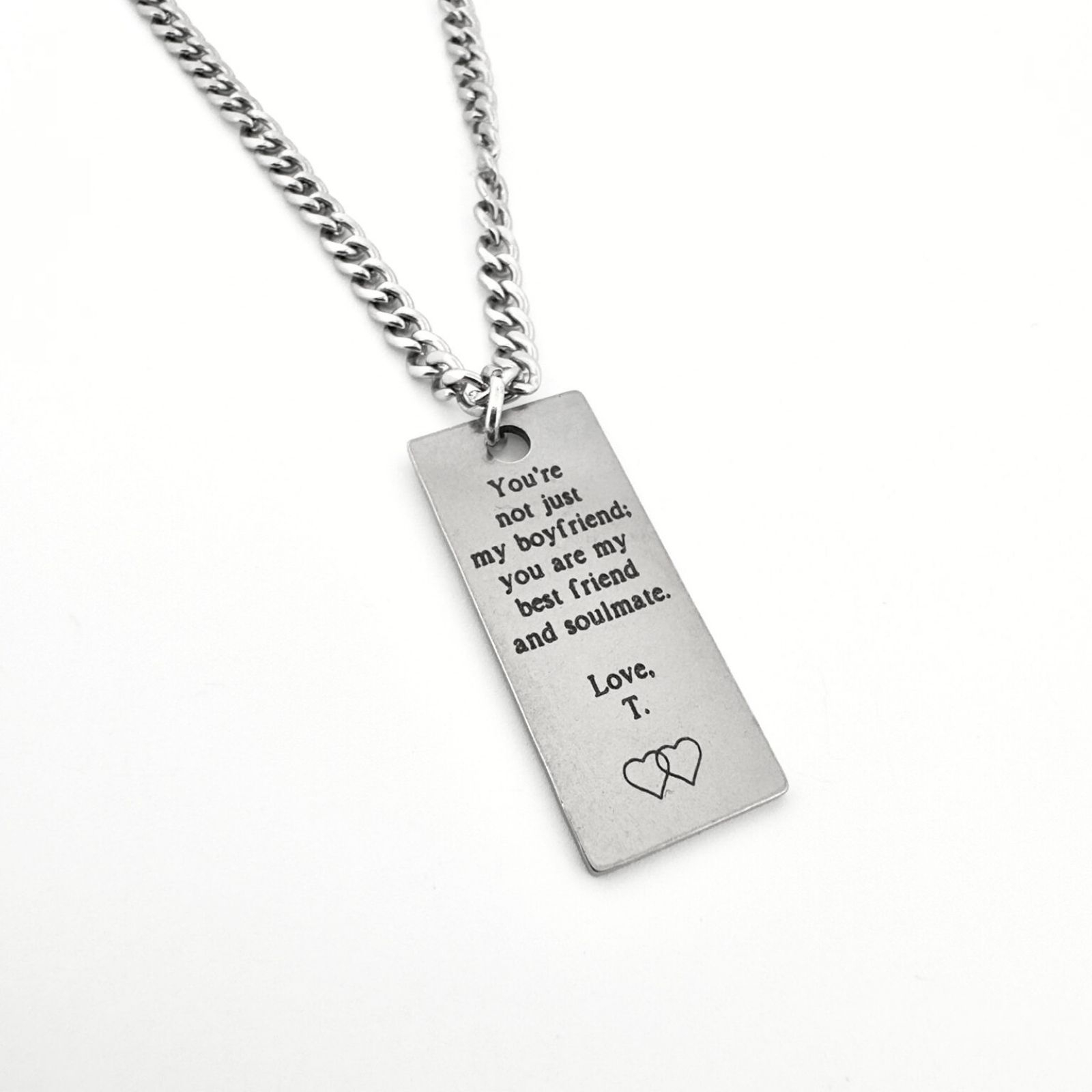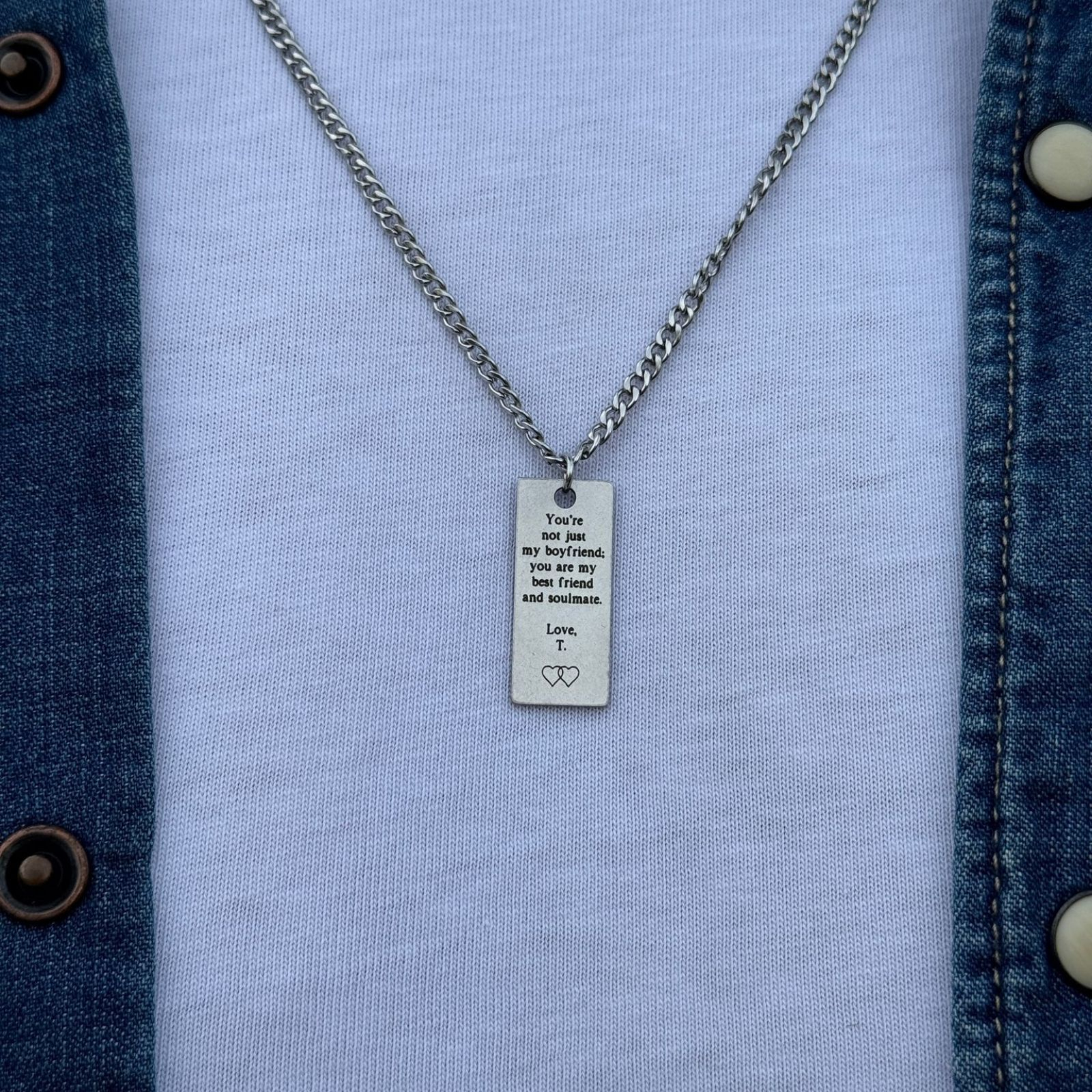 Potrivit ca dar pentru iubit, soț, frate sau tată, acest colier este o bijuterie cu semnificație. Un mesaj gravat pe plăcuță transformă un accesoriu simplu într-o amintire de neuitat.