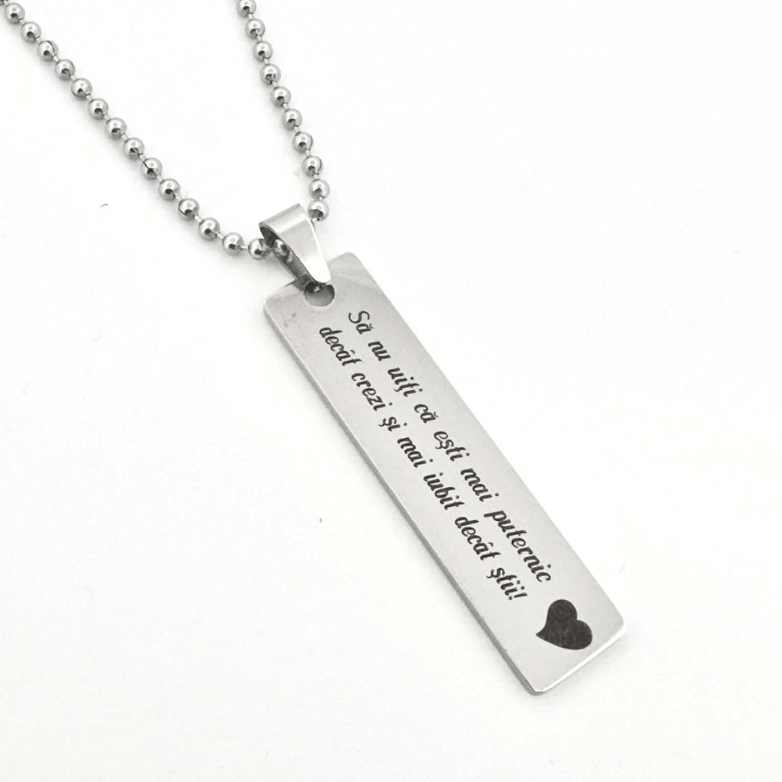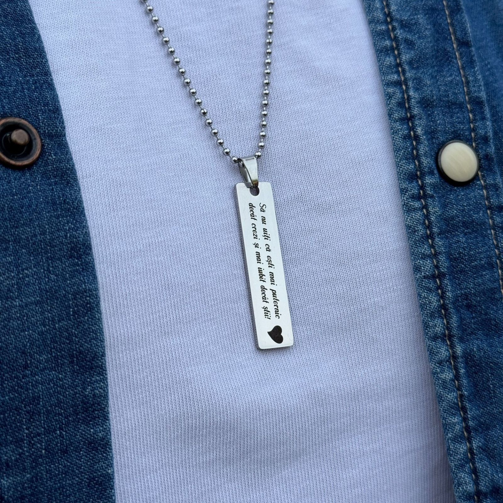 Poartă-ți povestea și mesajele speciale aproape de inimă cu acest lanț inox bărbătesc cu pandantiv personalizat din oțel inoxidabil. Lanțul cu pandantiv dreptunghiular minimalist, gravabil cu orice text, devine un accesoriu personal, masculin și elegant, ideal pentru purtare zilnică sau ca un cadou unic.