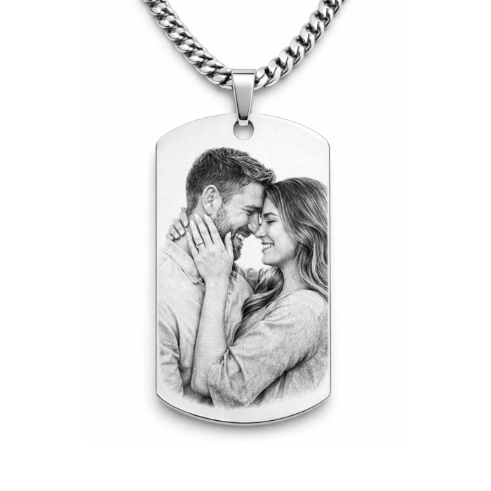 Transformă o fotografie și un mesaj într-o bijuterie unică. Acest lanț personalizat pentru bărbați combină emoția unei amintiri cu un design puternic, masculin.